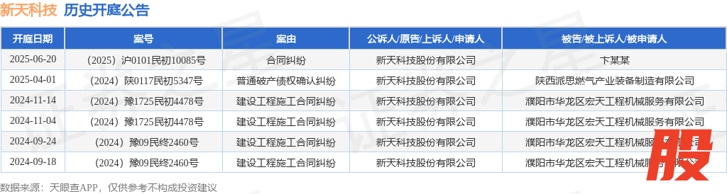 案号:(2025)沪0101民初10085号审理法院:上海市黄浦区人民法院案由:合同纠纷当事人信息: 原告/上诉人:新天科技股份有限公司 被告/被上诉人:卞某某开庭日期:2025年6月20日根据统计,近一年内以新天科技股份有限公司为当事人的历史开庭公告有6则,其中案由为“建设工程施工合同纠纷”的公告以4则居首,其次为“合同纠纷”有1则,“普通破产债权确认纠纷”有1则。历史开庭公告如下: