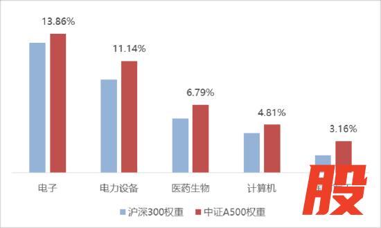 中证A500指数相较沪深300指数显著超配电子、电力设备、计算机、医药生物和国防军工等新质生产力方向,降低金融和消费等传统行业占比,使得指数能够全面刻画经济发展结构的变化与产业的转型升级,尤其是在科技成长行业的占比更高。